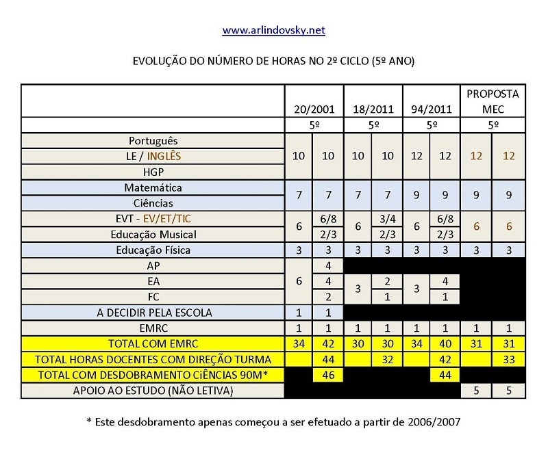 Enganem-se os que pensam que o objetivo de Nuno Crato será diferente do de Isabel Alçada. Nos quadros que apresento para o 2º ciclo verifico que apesar dos cortes que Nuno Crato apresenta o objetivo final é praticamente igual ao que a anterior Ministra tentou implementar com o Decreto Lei 18/2011, com uma pequena excepção no 5º ano em que esta proposta acresce 1 tempo de 45 minutos.