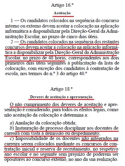 A penalização para os docentes dos quadros que não procederam a essa aceitação é a instauração de procedimento disciplinar com vista à demissão ou despedimento e aos contratados a anulação da colocação e a penalização de serem colocados na contratação inicial e na reserva de recrutamento no respetivo ano escolar e no seguinte.