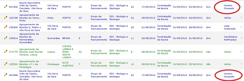 Colegas, pelos mails de resposta que tenho estado a receber de doa diretores de algumas escolas, existem horários que foram ocupados no concurso nacional, por professores da mobilidade, os quais estes ainda não conseguiram anular na aplicação. Parece-me que por defeito a DGAE pode ter colocado a observação de horário ocupado, nos horários que tinham sido ocupados no concurso nacional, até que os diretores de escola os consigam anular.