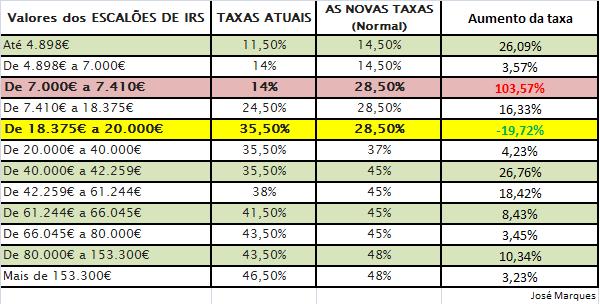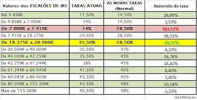 Analisando as novas taxas de IRS que estão na proposta de Lei do Orçamento do Estado para 2013 (página 203) e conjugando com os valores atuais da taxa obtêm-se a seguinte tabela: