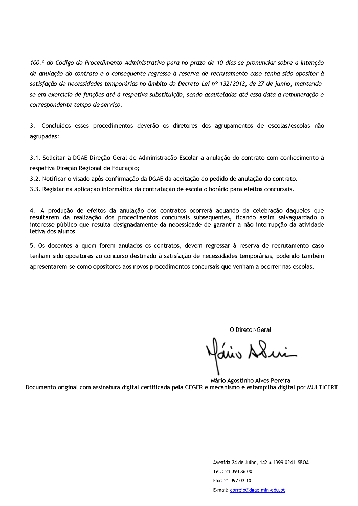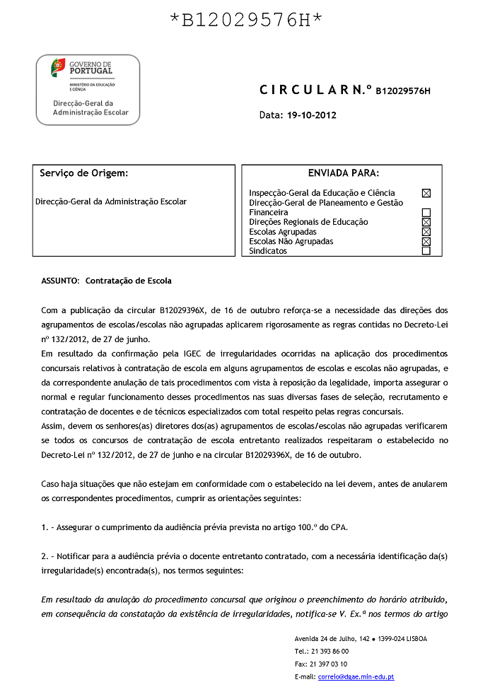 A DGAE publicou hoje a circular B12029576H, de 19 de Outubro de 2012, que vem dar orientações às escolas de como procederem para a anulação dos contratos que não respeitaram o Decreto Lei 132/2012, com as orientações dadas pela circular B12029396X, de 16 de Outubro de 2012, nos critérios e procedimentos de selecção dos candidatos.