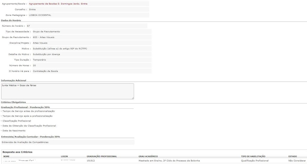 Muito boa tarde, o meu nome é FC e venho por este meio apresentar uma queixa em relação à selecção incorrecta do candidato para o horário 67 do grupo 600 do Agrupamento de escolas D. Domingos de Jardo.