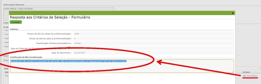 Fui rever a minha candidatura e vejo que no estado está escrito Não considerar, como demonstra o anexo, e em justificação da não consideração está escrito:
