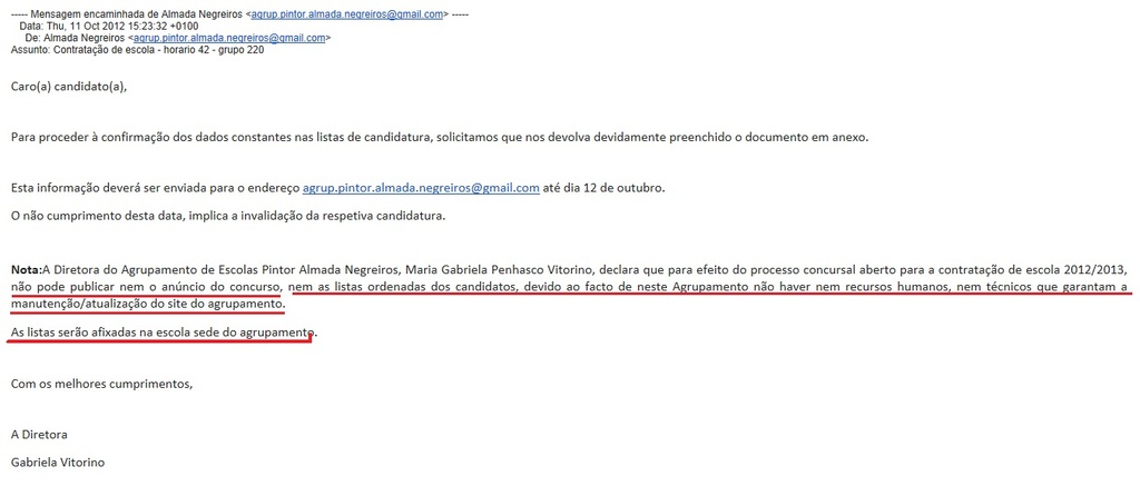 No entanto extra candidatura terminada, e após lista ordenada, enviou para os candidatos, a dia quatro de outubro de dois mil e doze, o seguinte mail: