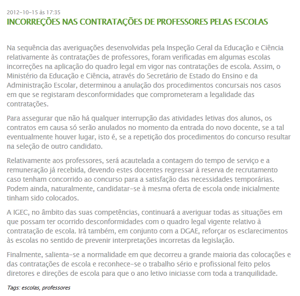 O mail que recebi também contém uma informação dada pela DREN que já pensei nela e dentro de algum tempo tentarei abordar num post e que tem a ver com o facto de um horário zero ser colocado numa outra escola no presente ano ver considerada essa sua nova escola como lugar obrigatório para trabalhar em 2013/2014, mesmo depois de um concurso nacional.
