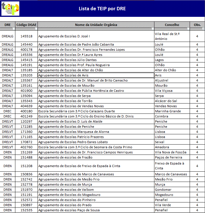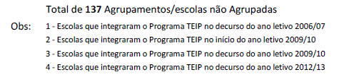 Nesta lista não sei se estão já incluídas todas as novas escolas TEIP que começam a funcionar a partir de Janeiro de 2013. Como o documento refere-se a 137 escolas TEIP no total e ouvi falar que passariam a existir 152 podem ainda faltar algumas escolas.