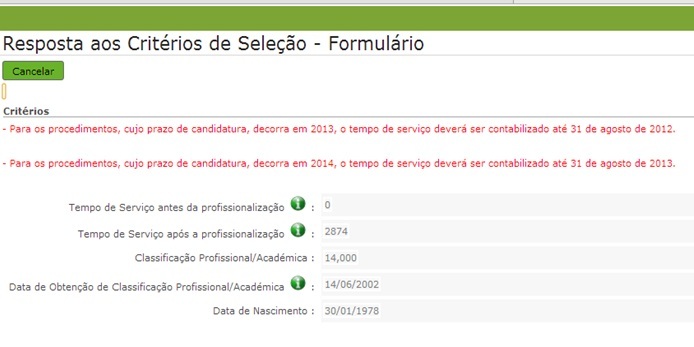 Até no printscreen que lhe envio em anexo da minha candidatura da altura, se consegue ver a vermelho que o tempo de serviço a colocar a ofertas de escolas que decorram em 2013 e não a partir de 30 de janeiro de 2013 como eles querem alegar.