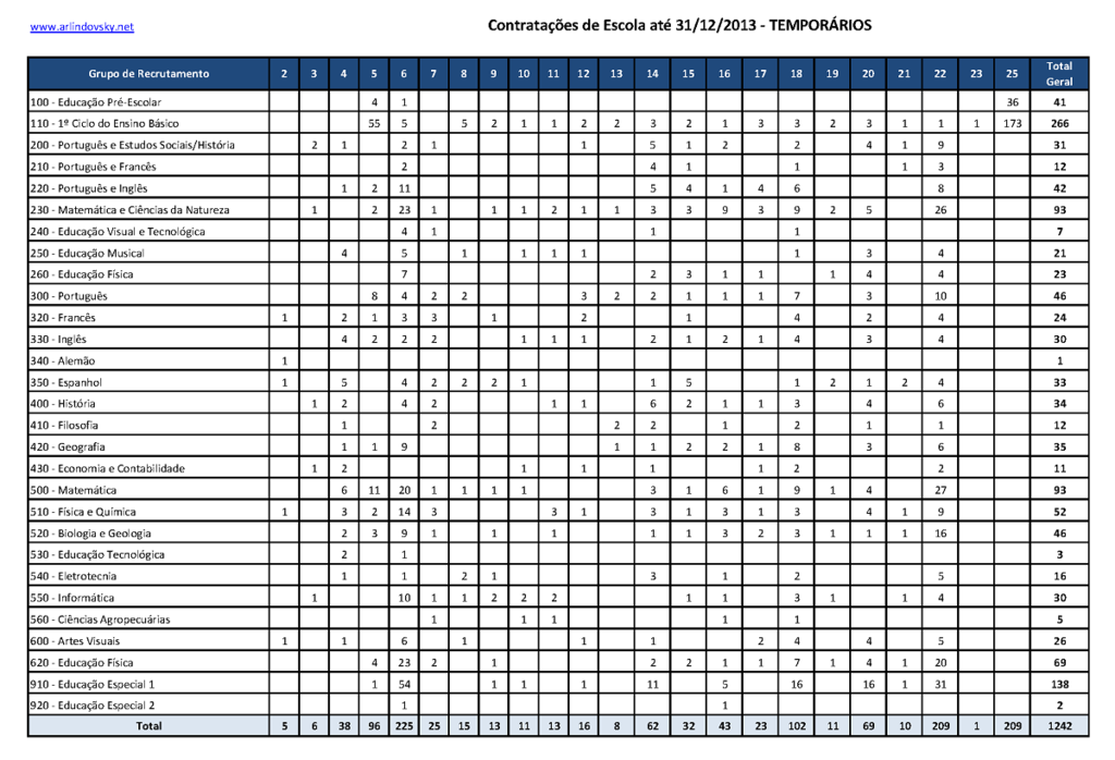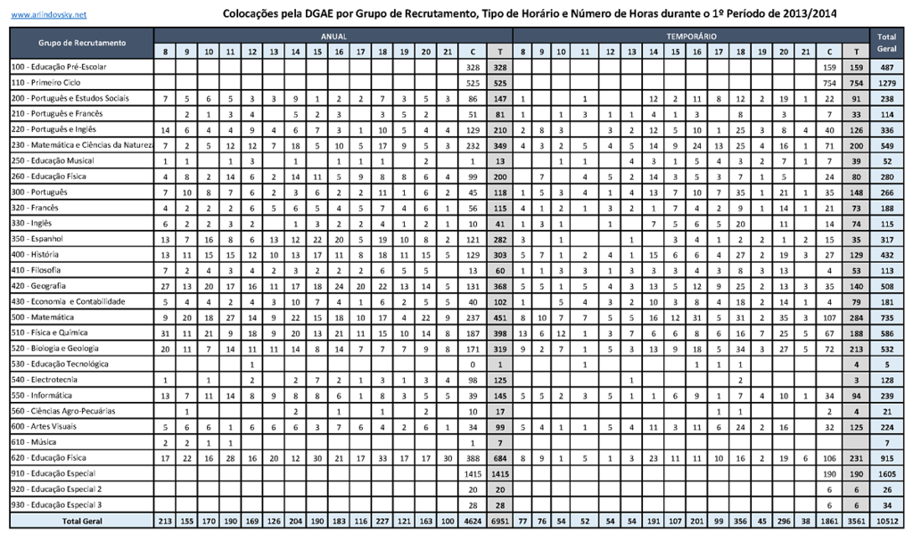 Em 12 de Setembro de 2013 (primeira colocação de contratados) existiram 346 renovações e 5454 colocações em horário anual, sendo 2948 com horário completo.