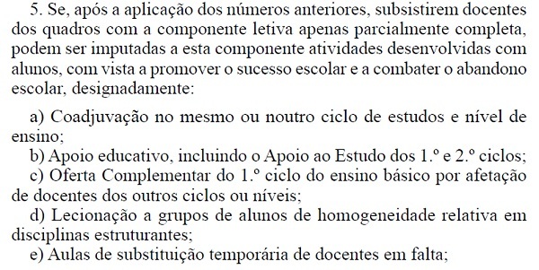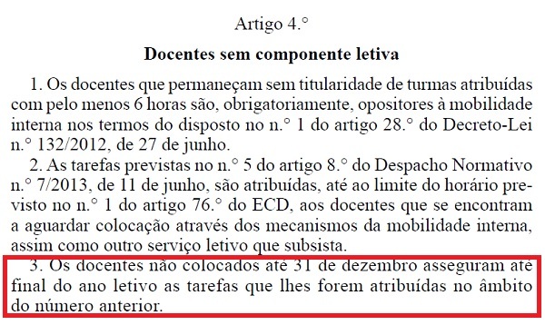 De acordo com o Despacho Normativo 7-A/2013, de 10 de Julho, os docentes sem componente letiva e não colocados até 31 de Dezembro asseguram até final do ano letivo as tarefas que lhes forem atribuídas no âmbito do número 5º do artigo 8º do Despacho Normativo 7/2013, de 11 de Junho.
