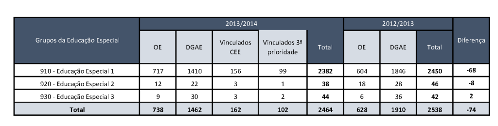 O quadro seguinte apresenta o número comparativo dos docentes na Educação Especial em relação ao ano letivo anterior. Até ao momento existem apenas menos 74 colocações do que em igual período do ano passado, no entanto, os grupos de recrutamento da educação especial conseguiram ter este ano mais 274 docentes integrados nos quadros.