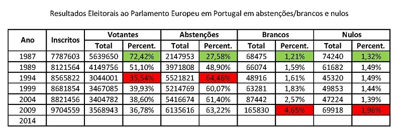 Até hoje, o ano com maior abstenção em Portugal para as eleições ao parlamento europeu foi em 1994 com 64,46% de abstenções.