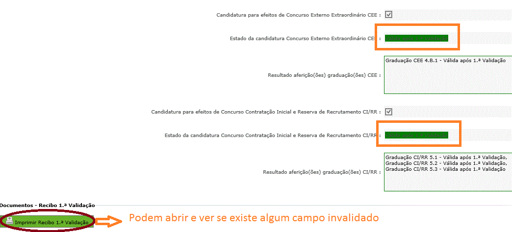 Depois é aberto um quadro resumo com o estado de validação da vossa candidatura.
