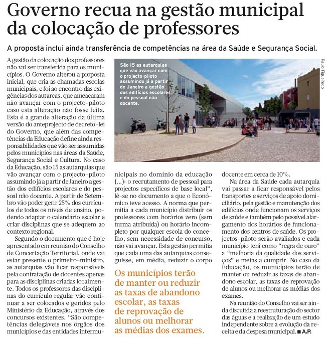 Com a manutenção da colocação de professores como tem sido feita até aqui, com excepção das disciplinas de currículo local que passará a ser competência dos 15 municípios que estão inseridos no projeto-piloto.