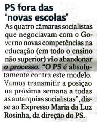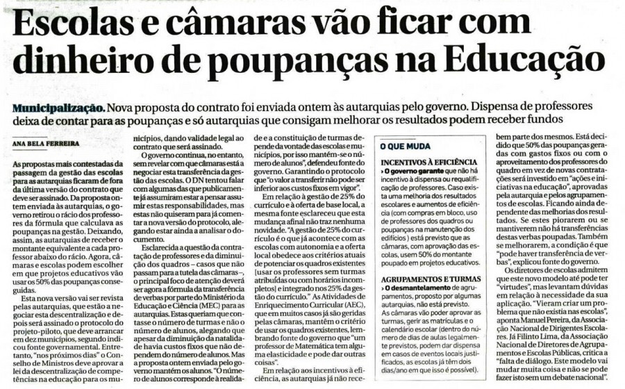 Recorde-se que várias escolas já se manifestaram contra esta transferência de competências, depois de terem apreciado as versões anteriores da proposta do Governo. Contudo, a Administração Central está confiante que esta posição se alterará depois de analisada o actual contrato proposto.