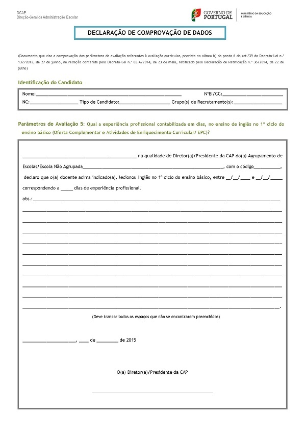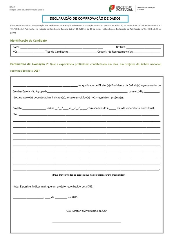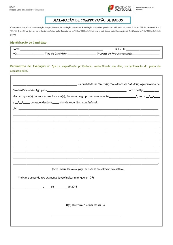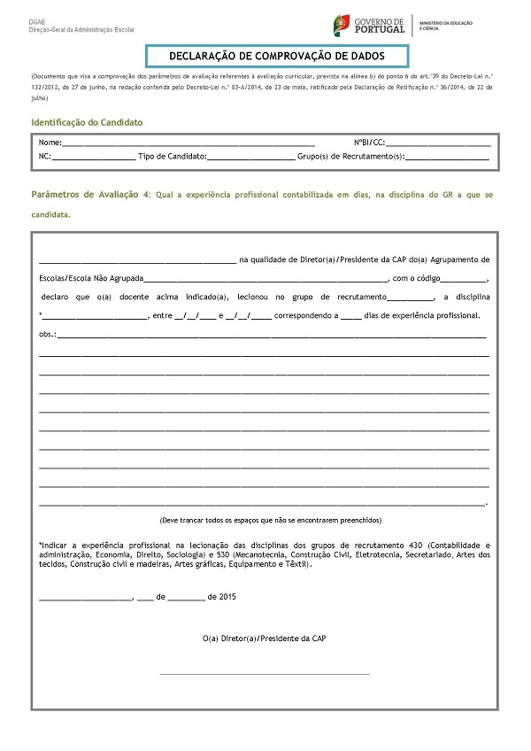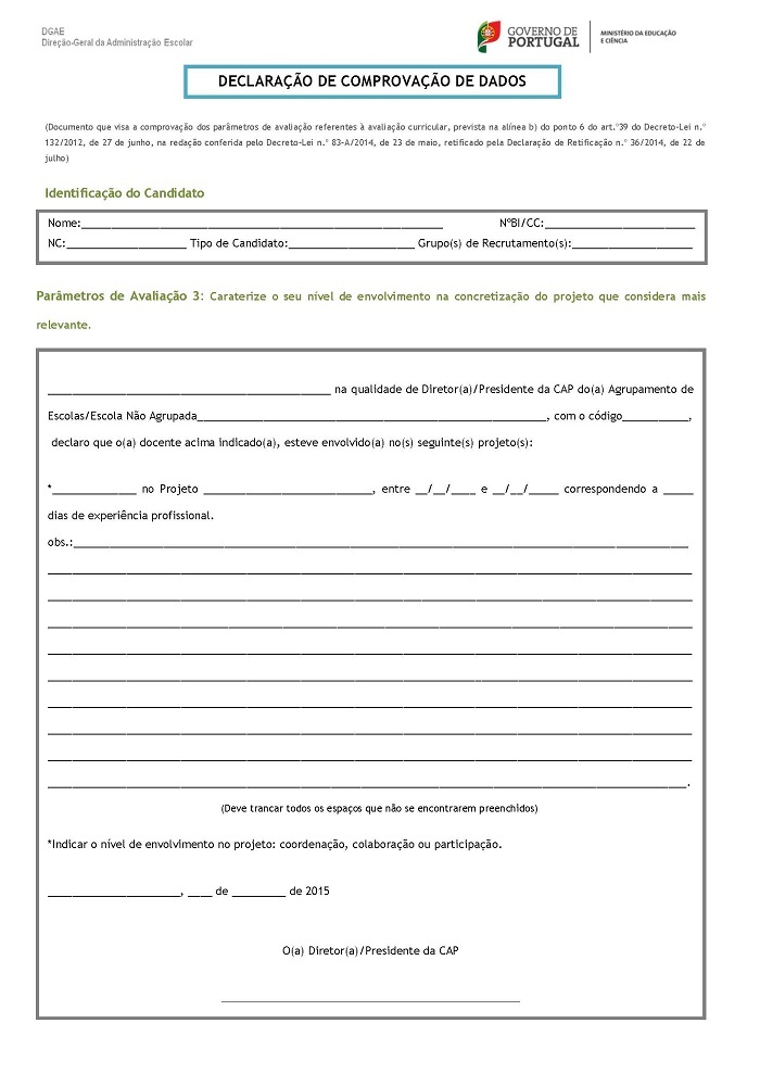 No âmbito da Bolsa de Contratação de Escola, prevista no n.º 1 do art.º 40.º, conjugado com o n.º 7 do art.º 39, ambos do Decreto-Lei n.º 132/2012, de 27 de junho, na redação conferida pelo Decreto-Lei n.º 83-A/2014, de 23 de maio, retificado pela Declaração de Retificação n.º 36/2014, de 22 de julho, solicitamos aos responsáveis pelos agrupamentos de escolas ou escola não agrupada, o preenchimento da Declaração de Comprovação de Dados dos docentes que lecionam ou lecionaram nesse AE/ENA, mediante solicitação dos mesmos, para efeitos de candidatura à Bolsa de Contratação de Escola.