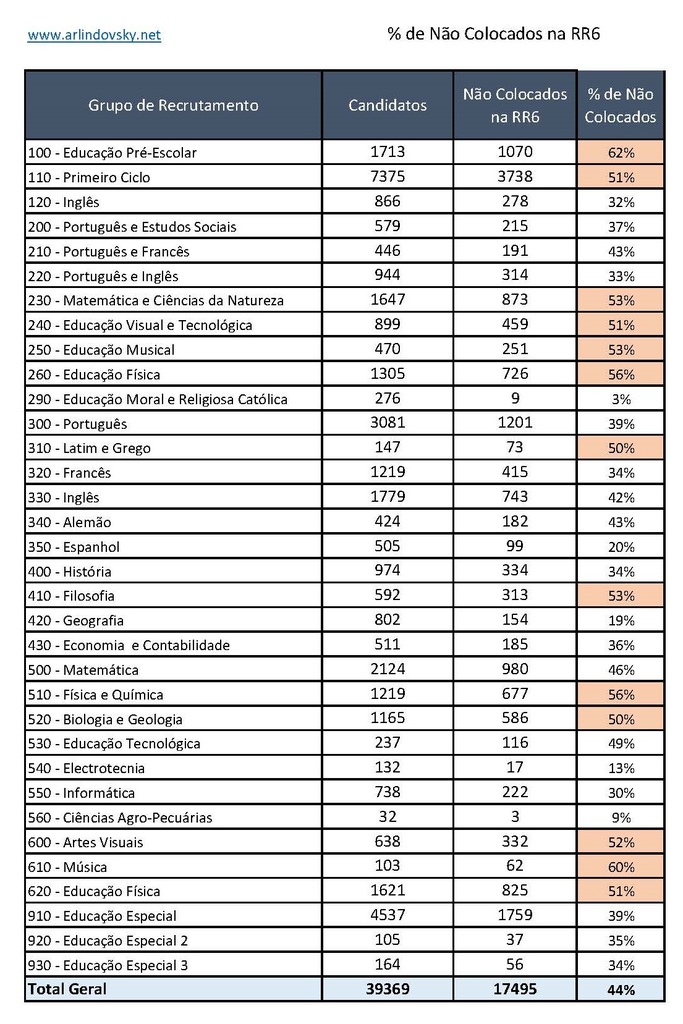 O próximo quadro apresenta a percentagem de candidatos à contratação que ainda não foram colocados por grupo de recrutamento depois de publicada a reserva de recrutamento 6.