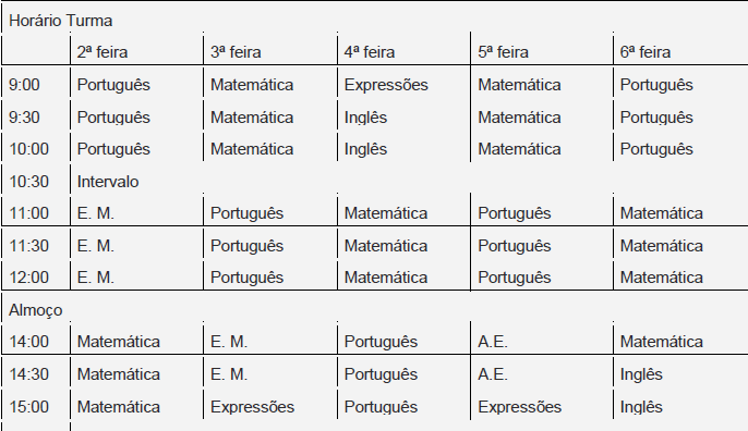 (Atenção: prolonga-se o horário em 30 minutos, na hora de saída, para melhor acomodar o horário escolar às necessidades laborais dos Encarregados de Educação que “despegam” às 19 horas)