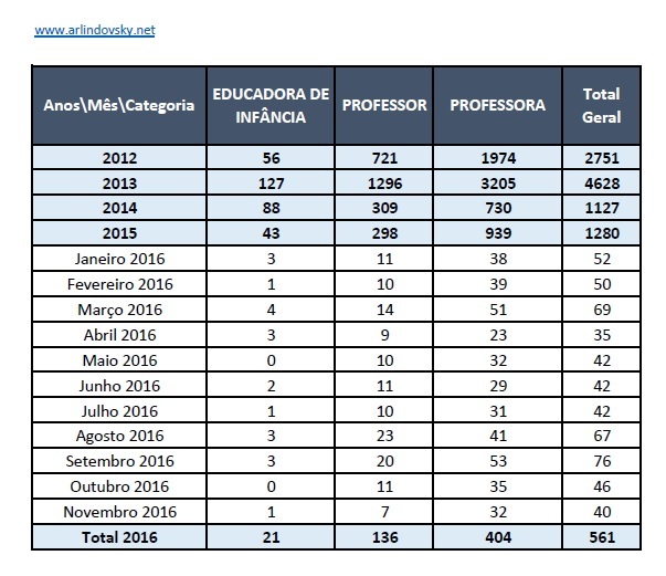 Fica o quadro geral de 2016 onde falta apenas a listagem referente a Dezembro para se fechar o ano de 2016 que tem o menor número de aposentações nos anos em análise.