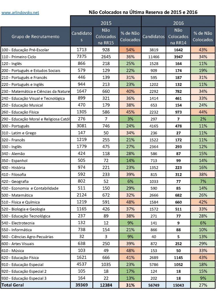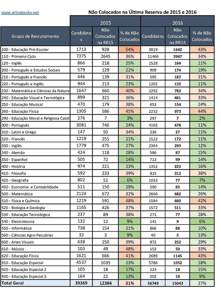 O próximo quadro serve para comparar quantos docentes estão por colocar em idêntico período. O quadro compara a última reserva de 2016 com a última reserva de 2015 e compara em cada um dos anos o número de candidatos em cada grupo de recrutamento.
