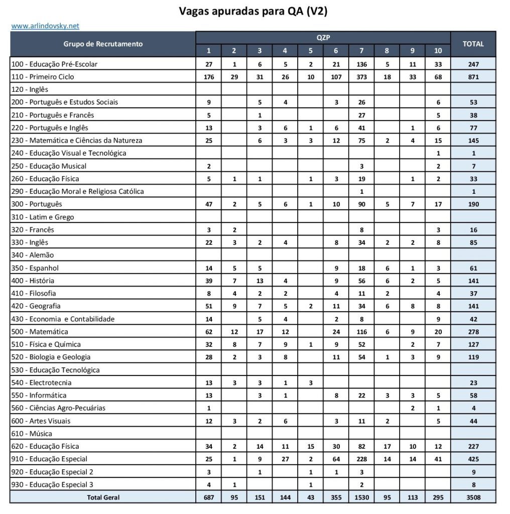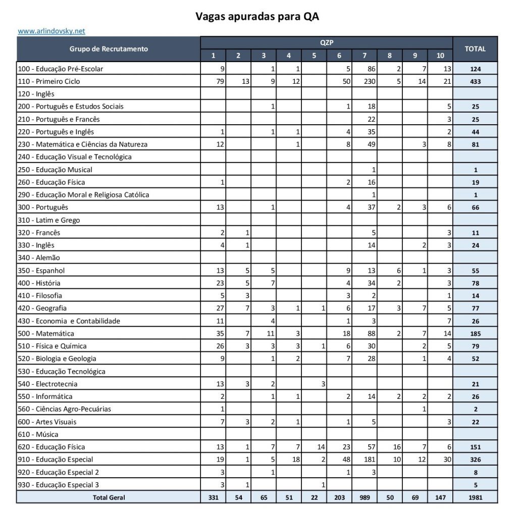 As cerca de 2000 vagas apuradas, distribuídas por QZP e Grupo de Recrutamento estão apresentadas no quadro seguinte.
