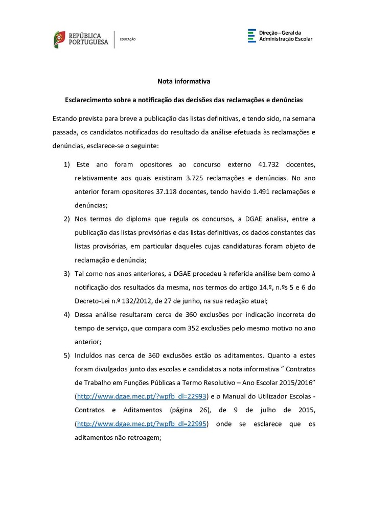 No entanto, falei com vários colegas e alguns foram informados que correu um programa informático que exclui as situações que não eram claras e previstas, não tendo analisado, pelo menos na maioria, caso a caso, nem confirmando com as escolas a veracidade dos dados do registo biográfico dos professores afetados e excluídos. Algumas das situações que me foram relatadas e a minha inclusive, prende-se com o tempo de serviço dos contratos e aditamentos feitos aos mesmo. Ou seja, o programa não previu situações em que a média de dias dava 365,80, arredondando-se para os 366, considerando automaticamente excluídos os candidatos que apresentassem os 366 dias. Outra situação completamente bizarra foi uma colega que está no Instituto dos Pupilos do Exército, que não recebe os processos dos professores e a escola de validação foi a do ano anterior onde o processo ficou. Ela colocou a escola onde foi colocada, o Instituto, e a escola de validação a do ano anterior. O programa considerou estes dados errados e excluiu automaticamente a colega. Há uns meses saiu uma portaria indicando que os colegas em anos anteriores que tivessem estado de baixa médica mais de 30 dias, teriam direito à contagem normal e retroativa do tempo de serviço, tendo havido colegas que lhes foi reconhecido o tempo de serviço de anos anteriores. Houve inclusive processos ganhos em Tribunal de situações que se prendem com este assunto ou outros. Como o programa apenas reconhece o máximo de 366 dias no ano letivo anterior, foram, assim, excluídos automaticamente porque tinham os 366 dias, mais os dias de tempo de baixa reconhecidos pela referida portaria ou processos em tribunal porque só poderiam apresentar os 366 dias de tempo de serviço num ano letivo.