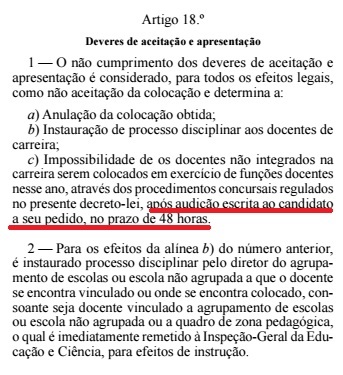 A aplicação destina-se à realização de audição escrita nos termos da alínea c) do n.º1 do artigo 18.º do Decreto-Lei n.º 28/2017, 15 de março. O candidato pronuncia-se, caso assim o entenda, no prazo de 48h, sobre o incumprimento do dever de aceitação/apresentação da colocação.