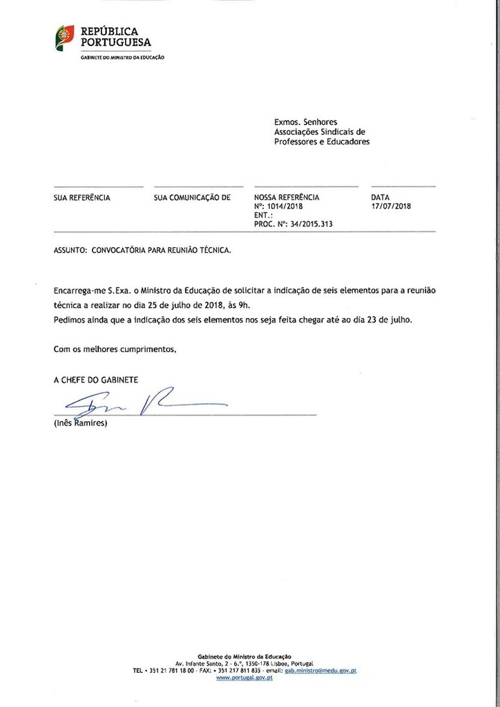 Esta reunião foi ontem convocada e realizar-se-á em 25 de julho, pelas 9:00 horas. Será uma reunião em que as organizações sindicais estarão representadas por seis elementos vocacionados para o trabalho técnico (2 da FENPROF, 2 da FNE e 2 da Frente Sindical de Docentes). Será uma única reunião, eventualmente alargada a outra, não estando prevista a criação de qualquer comissão para este efeito.