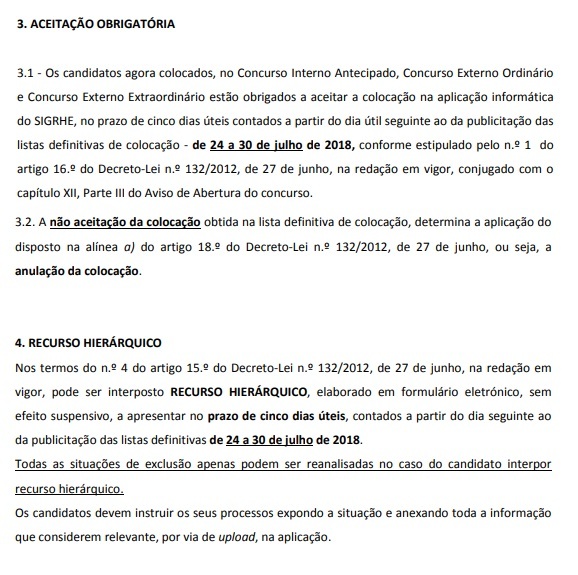 No cumprimento do calendário do concurso de docentes, inicia-se agora o período de aceitação da colocação e apresentação de recurso hierárquico, salvaguardando-se a colocação atempada dos docentes nas escolas. Todos os candidatos admitidos ao concurso externo ordinário e que não obtiveram colocação seguem para o concurso de contratação inicial, cujas listas, também de acordo com o calendário publicado, serão conhecidas no final de agosto.