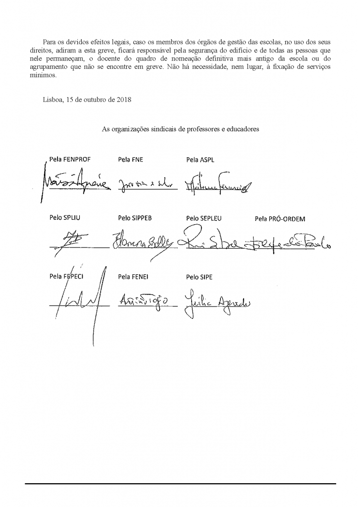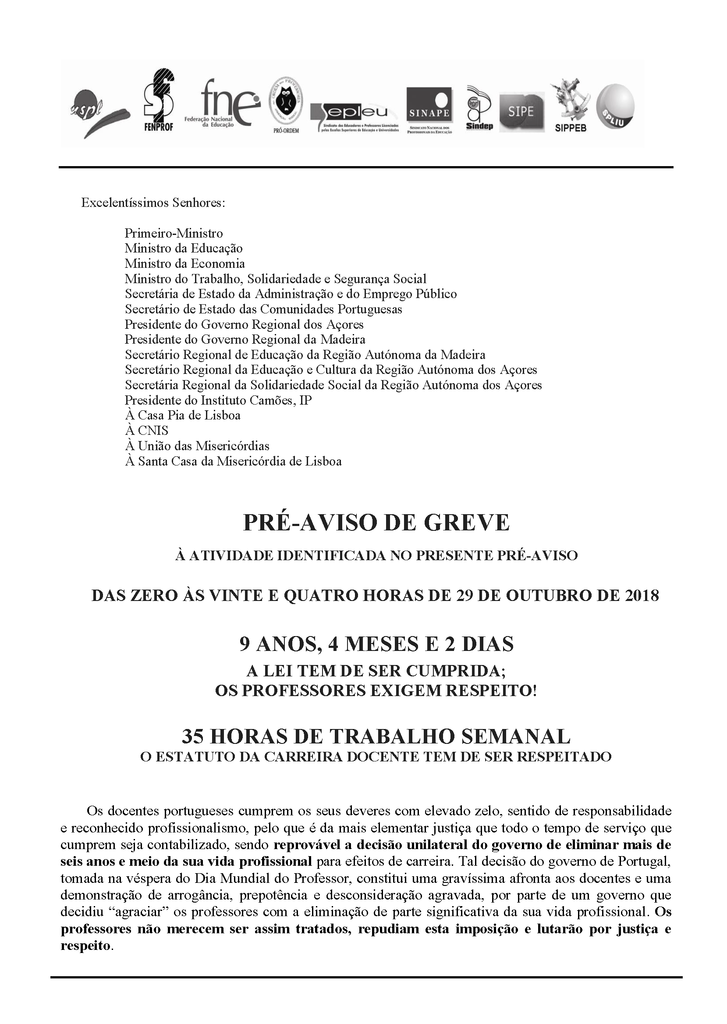 As organizações sindicais de professores e educadores entregaram no Ministério da Educação, e fizeram seguir para outras quinze entidades, pré-avisos de greve diários, o primeiro dos quais para 29 de outubro.