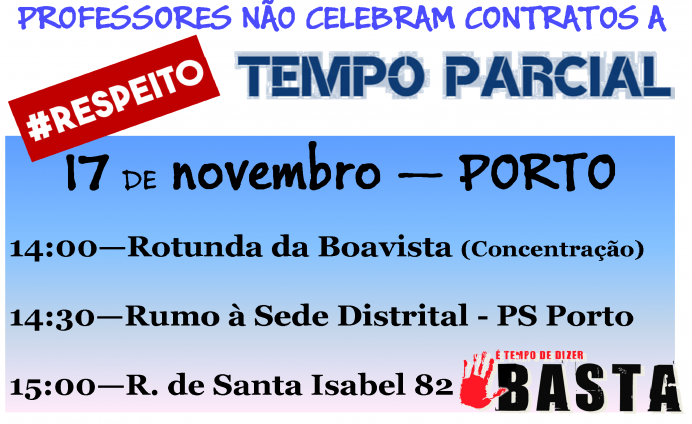O PS ficou de reunir connosco, até à data não marcaram a dita reunião. Para que este assunto volte de novo à agenda mediática, tencionamos realizar uma manifestação no Porto, dia 17 de novembro, pelas 15h. Para tal, precisamos de um número significativos de professores.
