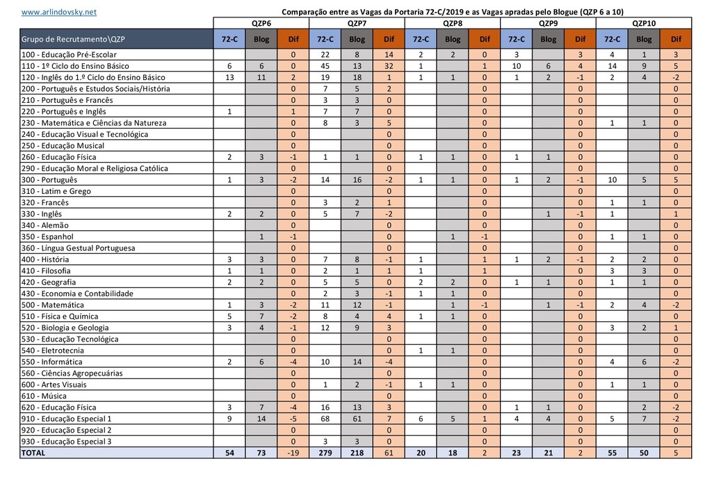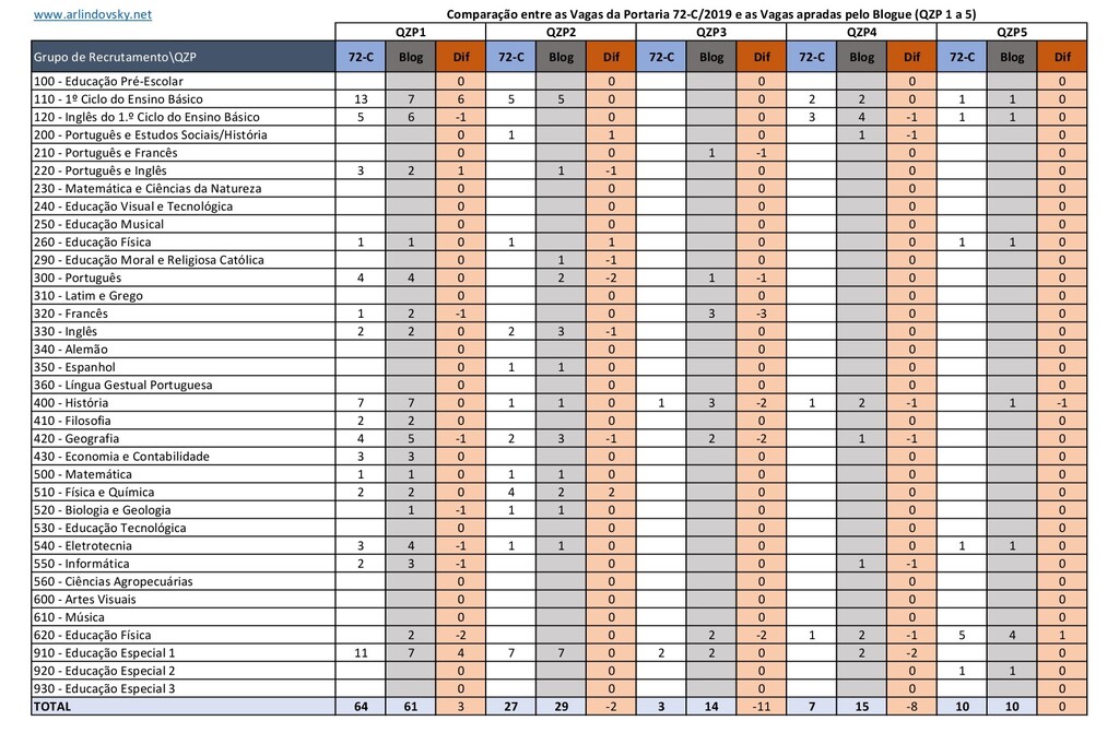 O seguinte quadro elaborado pelo Luís Cansado faz a compilação das vagas abertas e publicadas hoje na Portaria 72-C/2019.