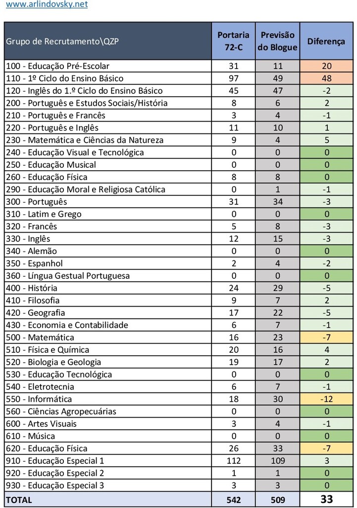 Com a publicação da portaria que fixa as vagas abertas por grupo de recrutamento e QZP, percebe-se que as previsões do blogue se confirmaram na sua maioria (relembro que os nossos números foram lançados em setembro do ano passado). A previsão considerava menos 33 vagas daquelas que a portaria fixa e foi nos grupos 100 e 110 que as diferenças mais se fizeram notar. Não se exclui neste momento ainda a possibilidade da DGAE pedir comprovativos de contratos dos candidatos indicados pelas escolas, pelo que as vagas poderão não corresponder em 100% aos candidatos indicados na 1º prioridade nas listas definitivas.