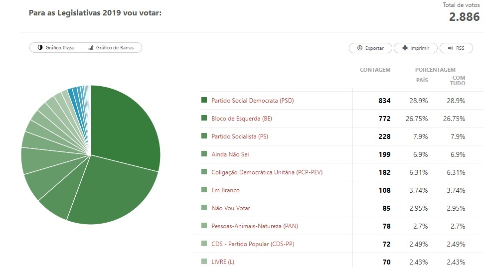 À frente neste votação ficou o PSD com 834 intenções de voto, representando 28,9%. O Bloco de Esquerda obteve a segunda posição com 772 votos (26,75%). O PS ficou em terceiro lugar com 228 votos (7,9%).