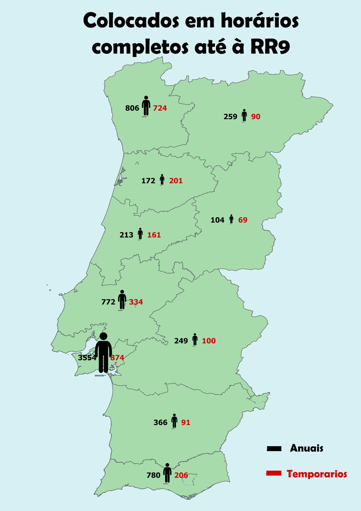 No mapa seguinte apresentam-se todas as colocações em horários completos (anuais e temporários) nos diferentes QZP’s. Como é claro para todos, no QZP 7 (e no sul de uma forma geral) a diferença entre temporários e anuais é muito maior.