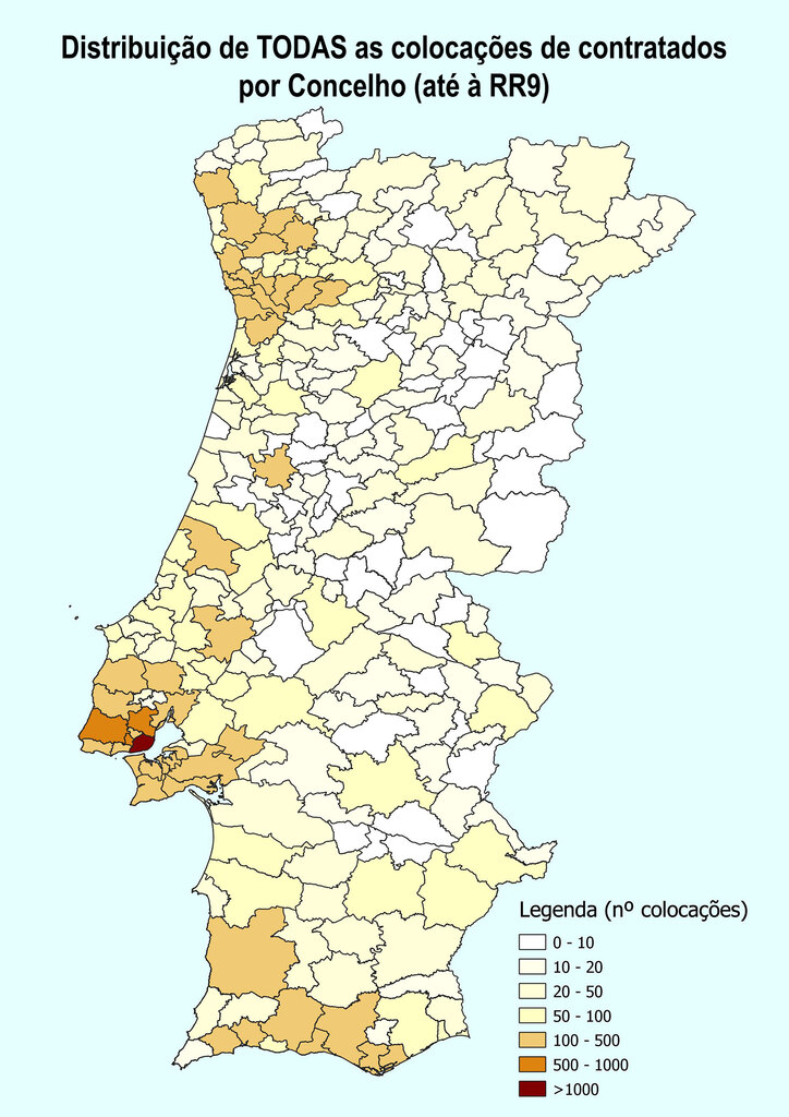 Consegue-se perceber que não há nenhum concelho no interior com mais de 100 horários e que acima de 500 apenas na zona da Grande Lisboa.