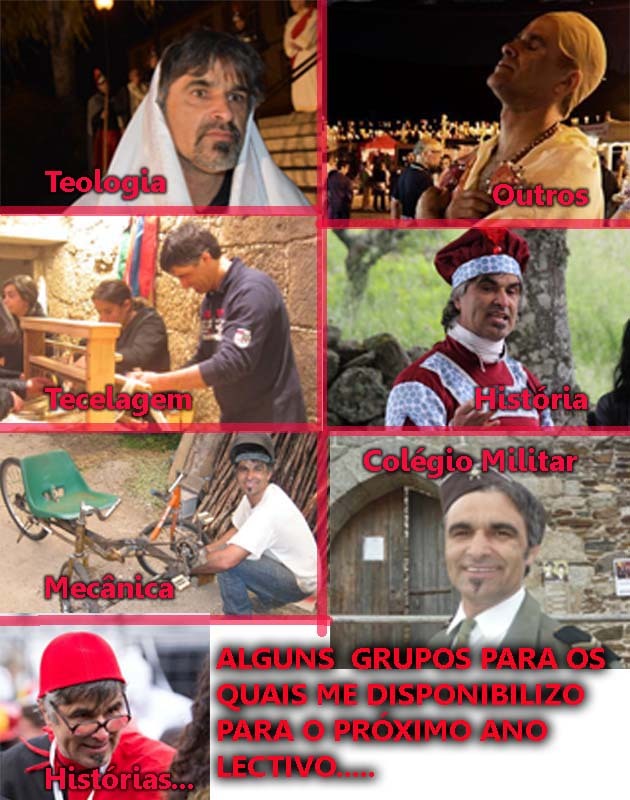 Eu próprio, depois de uma reflexão ligeira (nem sei se diga isto….) sinto-me preparado, para (a ver novamente pelo que consta do meu FACEBOOK, para dar: Latim, Grego e Hebraico; Espanhol, Francês, Inglês e Português ( e Italiano pra estrangeiros) – isto em Línguas; TODO TIPO DE EXPRESSÕES (pelos anos que levo de teatro, marionetas e afins); Liturgia/Teologia/filosofia e Psicologia (pelos anos de seminário); Mecânica (pelas diversas incursões na construção de figuras públicas, tais como Galo do entrudo, bocagalo, vacagalo etcs); História e Geografia (pelas aparições no património e no território Ibérico); Fisico-Quimica (pelo meu bom aspecto físico, e pela “química” que ainda desperto em alguns corações !).