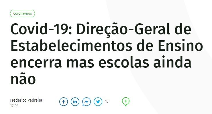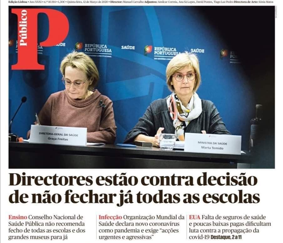 Assisti à conferência de imprensa da Ministra da Saúde e da Diretora Geral da Saúde (11 de março), a referirem que, para não se sacrificar a gestão da vida familiar de alguns portugueses e para não se exagerar sobre a perigosidade da atual situação, as escolas continuam abertas, salvo decisão casuística em contrário e até que surja um caso de infeção pelo Covid-19, em alguma escola.