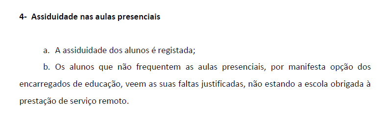 É minha opinião que as Direções e os Conselhos Gerias de todas as escolas públicas devem unir-se rapidamente na elaboração de um abaixo-assinado conjunto que deixe clara a discordância com o até aqui exposto, excluindo as suas escolas de quaisquer responsabilidade de futuros problemas. Mais: é inadmissível que um aluno opte por não assistir a aulas presenciais, tendo as faltas justificadas, mas se veja privado dos conteúdos das mesmas. Isto deve ser salvaguardado por orientação das escolas. Se o ME não desempenha o seu papel na luta pela equidade e contra a exclusão, desempenharemos nós, professores e direções.