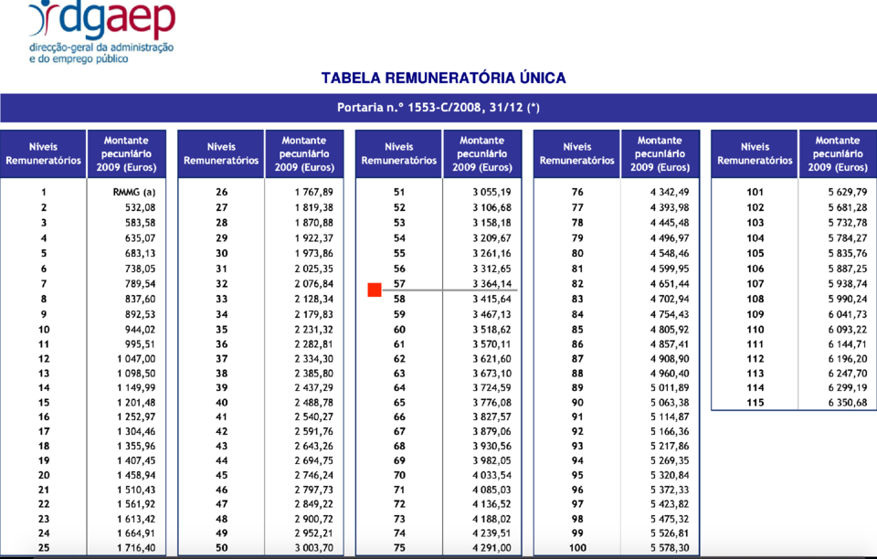 E como as primeiras páginas teimam na desinformação, resta-nos repetir o óbvio: há 115 índices remuneratórios na administração pública (a imagem é do site da Direcção-Geral da Administração e Emprego Público). O topo dos professores está no 57º lugar (sublinhei na imagem). Há 58 índices remuneratórios acima dos professores e o topo recebe quase o dobro; e mais 120% do que a média.