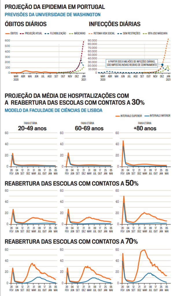 Num cenário de redução de contactos nas escolas a 70%, a equipa de Carmo Gomes aponta para uma média de hospitalizações idêntica à da primeira vaga, sendo que uma redução dos contactos a 50% permitiria um achatamento da curva para níveis menores do que os da primeira vaga. E a redução a 30%, evitaria com mais segurança uma segunda onda. «É exigente mas é possível», afirmou o especialista.