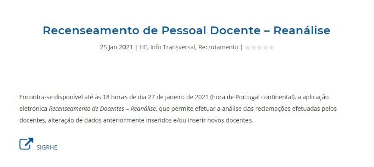 Encontra-se disponível até às 18 horas de dia 27 de janeiro de 2021 (hora de Portugal continental), a aplicação eletrónica Recenseamento de Docentes – Reanálise, que permite efetuar a análise das reclamações efetuadas pelos docentes, alteração de dados anteriormente inseridos e/ou inserir novos docentes.