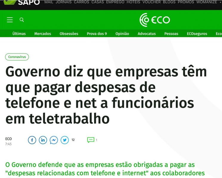 As empresas têm de suportar os custos de telefone e internet dos trabalhadores quando em teletrabalho, mas não as da água ou energia, diz o Governo. Esse encargo está previsto no Código de Trabalho, sendo que o teletrabalho obrigatório determinado pelo Estado de Emergência não suspende a Lei, noticia esta sexta-feira o Jornal de Negócios.