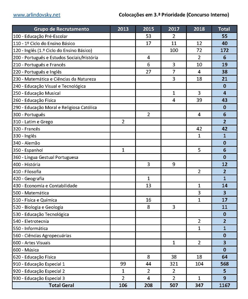 O primeiro dos dois quadros apresenta o número de colocados em cada grupo de recrutamento em 3.ª Prioridade no Concurso Interno (Mudança de Grupo de Recrutamento) desde o concurso interno de 2013. O segundo quadro mostra o número de docentes que saiu do seu grupo de recrutamento para ingressar noutro grupo de recrutamento.