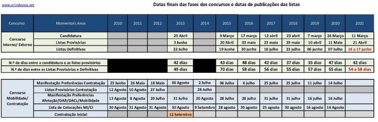 O número de dias entre a data de publicação das listas provisórias até à publicação das listas definitivas variou entre os 49 dias (2013) e os 70 dias (2015), no entanto nos últimos 5 concursos passou a estabilizar entre os 55 dias (2018 e 2020) e os 58 dias (2016).