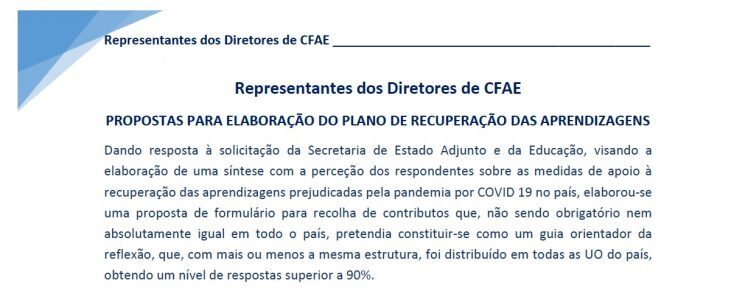 Dando resposta à solicitação da Secretaria de Estado Adjunto e da Educação, visando a elaboração de uma síntese com a perceção dos respondentes sobre as medidas de apoio à recuperação das aprendizagens prejudicadas pela pandemia por COVID 19 no país, elaborou-se uma proposta de formulário para recolha de contributos que, não sendo obrigatório nem absolutamente igual em todo o país, pretendia constituir-se como um guia orientador da reflexão, que, com mais ou menos a mesma estrutura, foi distribuído em todas as UO do país, obtendo um nível de respostas superior a 90%.