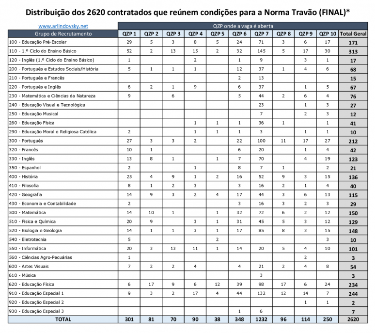 A tabela abaixo apresenta a distribuição desses candidatos por grupo de recrutamento e QZP onde a vaga será aberta. Se clicarem na tabela poderão aceder a uma listagem com todos os professores nessa situação!
