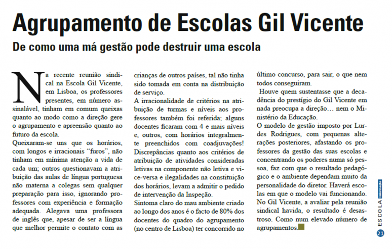 Na revista do SPGL (Escola Informação, n.º 279) de Outubro de 2021, foi publicada uma notícia sob o título: “Agrupamento de Escolas Gil Vicente. De como uma má gestão pode destruir uma escola”