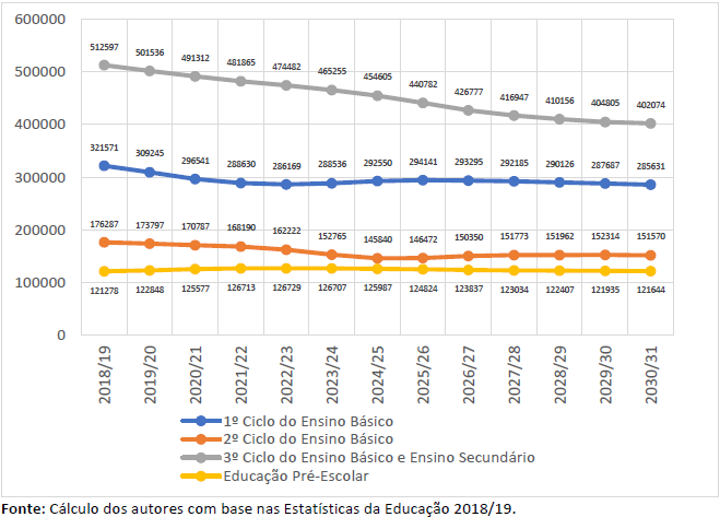 a) Na educação pré-escolar, o número de alunos entre 2018/19 e 2030/31 manter-se-á relativamente constante acima dos 121 mil alunos resultante da evolução demográfica observada recentemente e aquela que é projetada para os anos incluídos nesta análise.