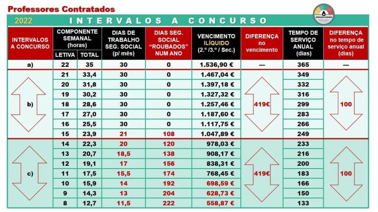 Nunca é demais chamar a atenção para o facto de existirem intervalos a concurso (público) cujo vencimento é INFERIOR ao Salário Mínimo Nacional (705€ em 2022) e que os intervalos inferiores a 16 horas letivas não declaram 30 dias/mês para a Segurança Social (com prejuízo para a reforma, subsídio de desemprego, etc.).