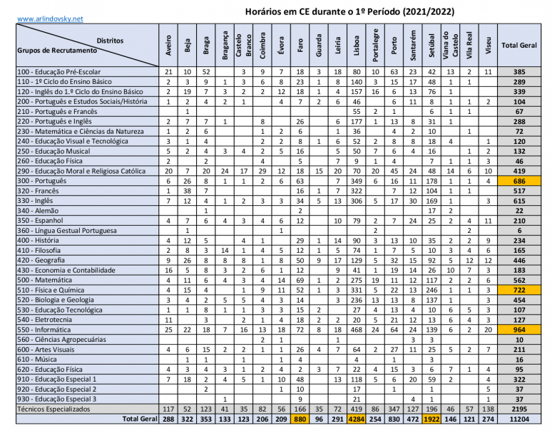 A maioria no distrito de Lisboa, Setúbal e Faro. Os grupos 550, 510 e 300 são os grupos com mais pedidos de horários. A tabela seguinte apresenta a distribuição desses horários pelos diferentes distritos.